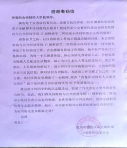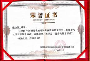 收到了来自银川市西夏区朔方路街道宁安巷居民委员会的感谢信,信中写道:强小凤在防疫工作关键时期挺身而出,无私奉献,为防疫工作贡献力量、为社区安全增添保障,弘扬和实践了青年志愿者精神,彰显了当代青年大学生的责任与担当。
