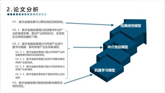 笪文倩同学《数字金融与碳排放:基于微观数据和机器学习模型的研究》一文,基于城市面板、工业企业数据库和瞪羚企业数据库等匹配的多维微观数据集,结合R语言地理坐标、爬虫、词频分析和企业生存分析等多项前沿技术构造重要变量,运用双向固定效应、工具变量和中介效应模型从多个角度实证研究了数字金融对碳排放的影响及其传导机制。更基于中国数字金融重点服务于需求端的现实,研究发现其主要通过数字科技的产业化和传统产业的数字化赋能两个渠道影响地区总体碳排放,这很好地统合了有关数字金融的争议。